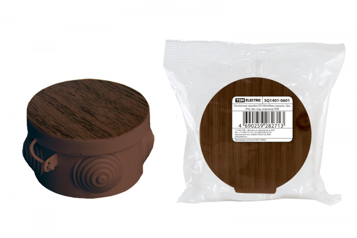 Распаячная коробка ОП D65х40мм, крышка , бук, IP54, 4вх. инд. штрихкод TDM