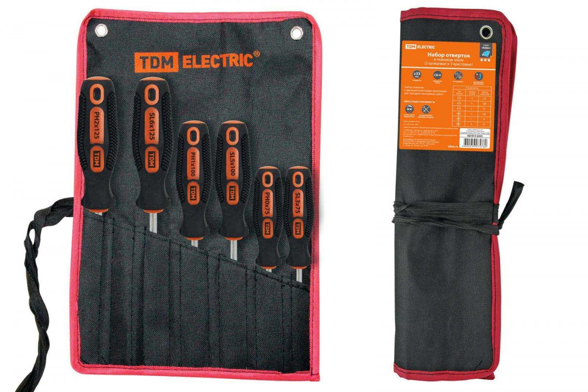 Набор отверток 6 шт.: SL:3x75 5x100 6x125, PH:0х75 1x75 2x100 (тканевый чехол), CR-V "Алмаз" TDM