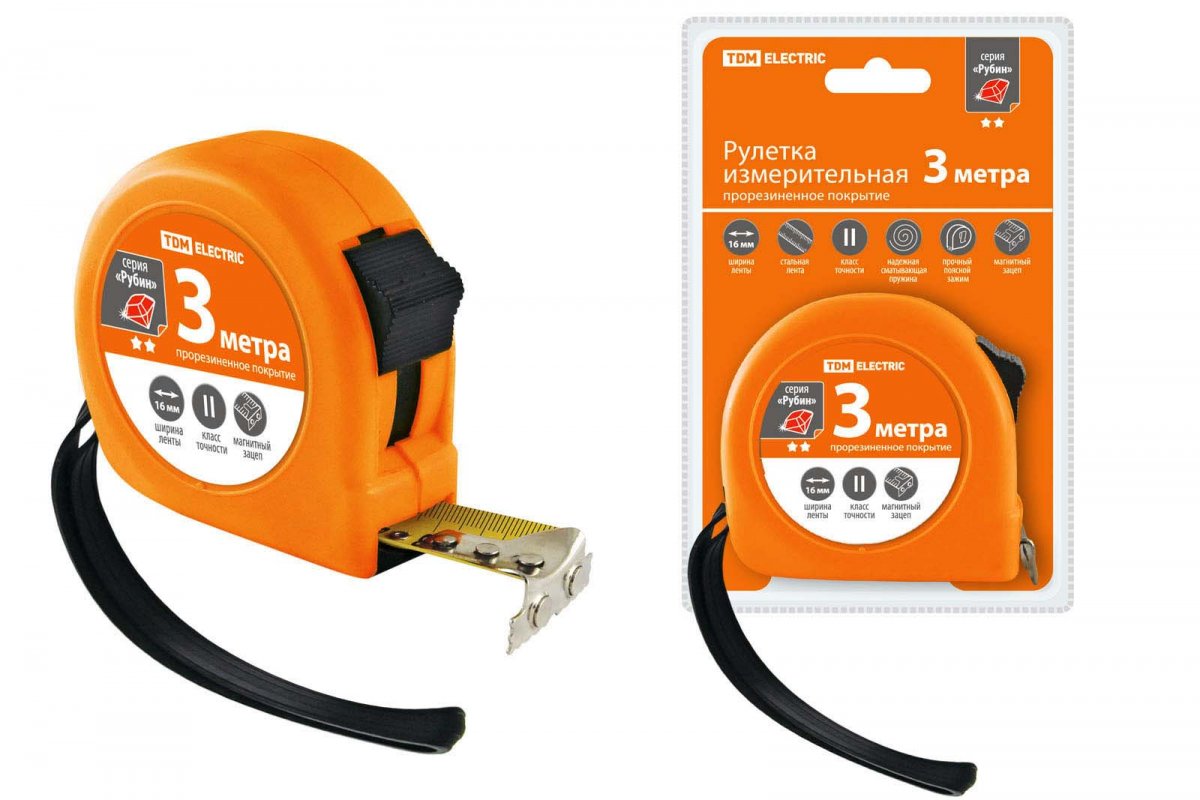 Рулетка, длина 3м, стальная лента, ширина 16 мм, прорезиненное покрытие, магнит, "Рубин" TDM
