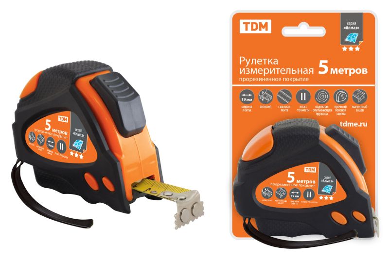 Рулетка 5 м х 19 мм, тройная фиксация, автостоп, обрезиненный корпус, магнит, "Алмаз" TDM (ЕС)