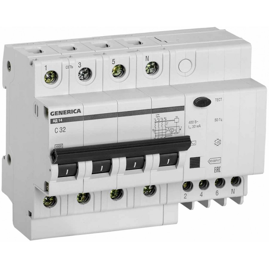 Диф.автомат АД14 4Р 32А 30мА GENERICA