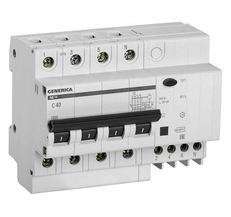 Выполняет функции защиты от поражения электрическим током и защиты от сверхтоков. Защита от сверхтоков в каждом полюсе. Предельная отключающая способность 4,5 кА.