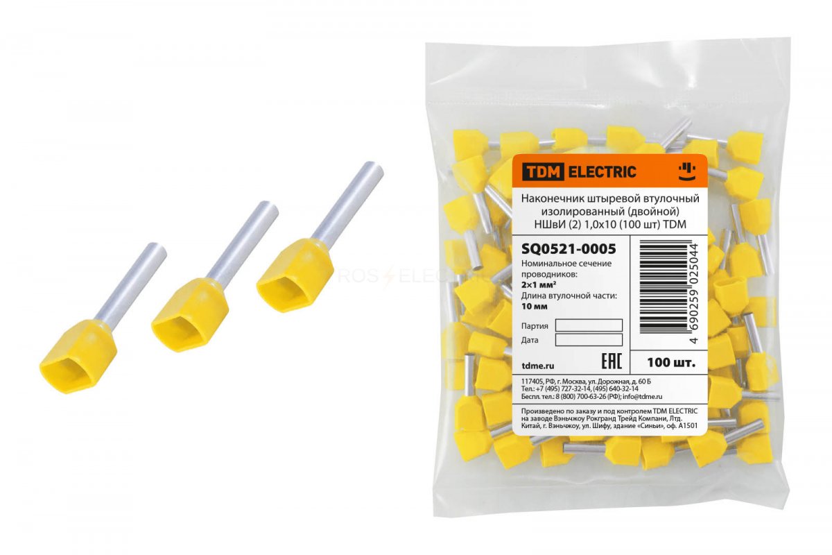 Наконечник штыревой втулочный изолированный (двойной) НШвИ (2) 1,0х10 желтый (100 шт) TDM (ЕС)