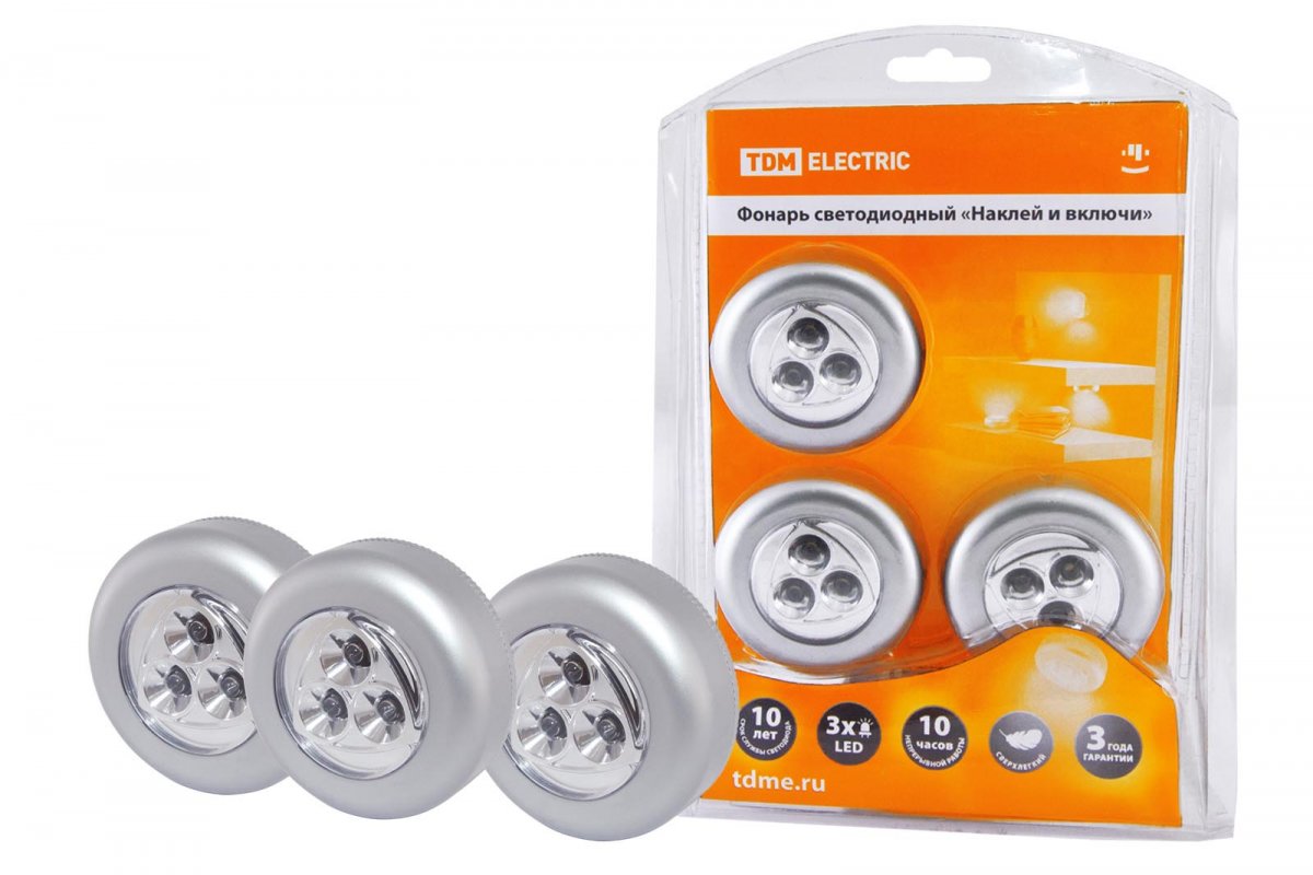 Фонарь светодиодный "Наклей и включи,3светодиода 9лм/Вт,батареи типа 3*АА(в комплект не входят) TDM